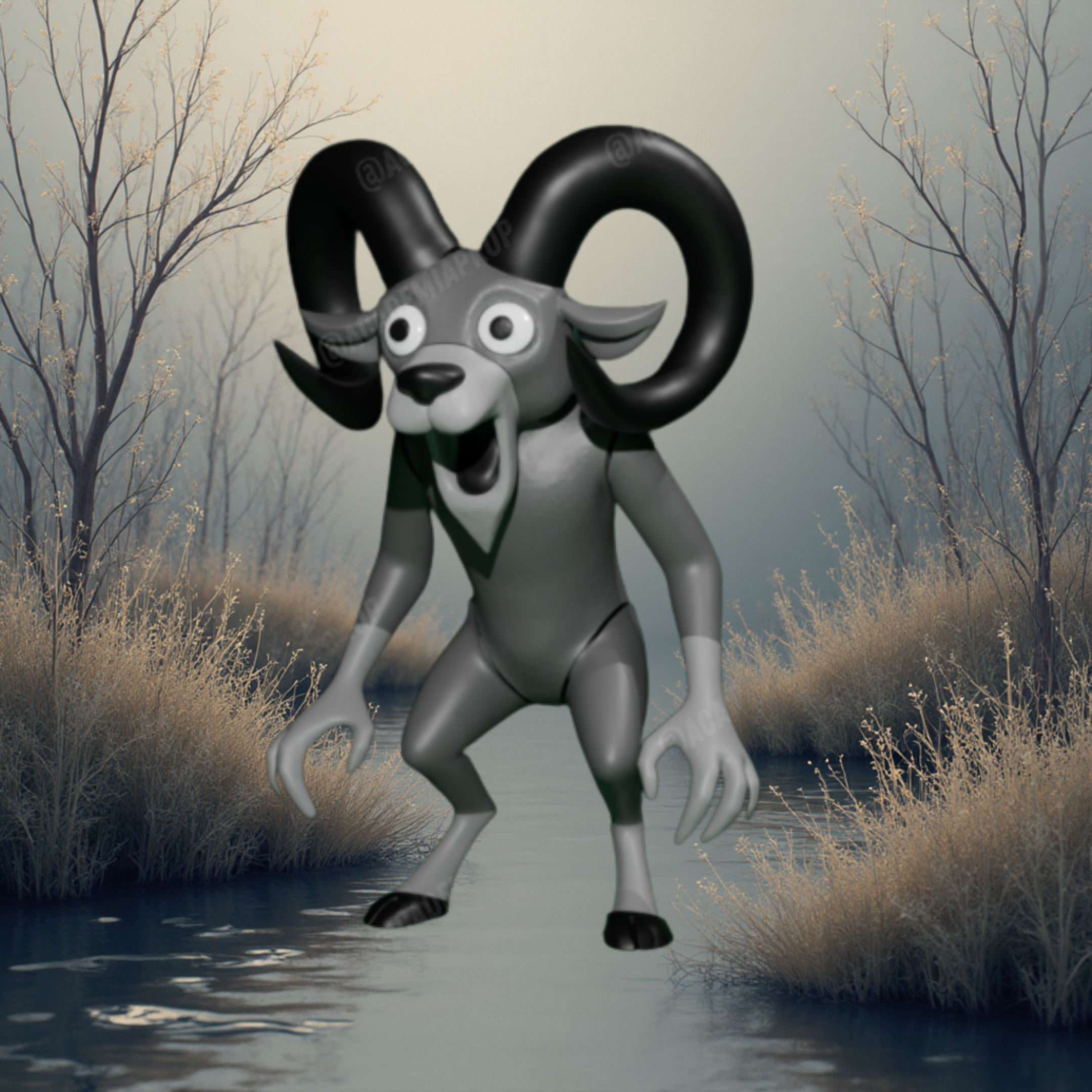 En lo más oscuro del bosque, La Cabra acecha. De piel gris, cuernos negros y una boca abierta en un grito eterno, se alza sobre dos patas como un humano, con ojos enormes que brillan entre las sombras. Su presencia anuncia que algo está muy, muy cerca.